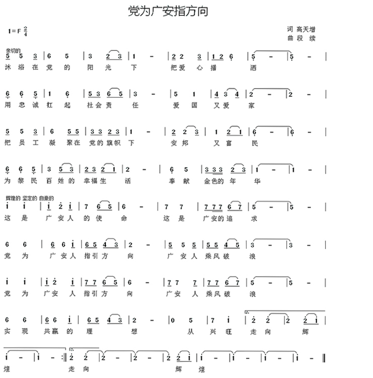 沐浴在黨的陽光下, 把愛心播灑;用忠誠扛起社會責(zé)任, 愛國又愛家;把員工凝聚在黨的旗幟下, 安邦又富民;為黎民百姓的幸福生活, 奉獻金色的年華;這是廣安人的使命, 這是廣安的追求;黨為廣安人指引方向, 廣安人乘風(fēng)波浪;黨為廣安人指引方向, 廣安人乘風(fēng)波浪;實現(xiàn)共贏的理想, 從興旺走向輝煌, 走向輝煌。