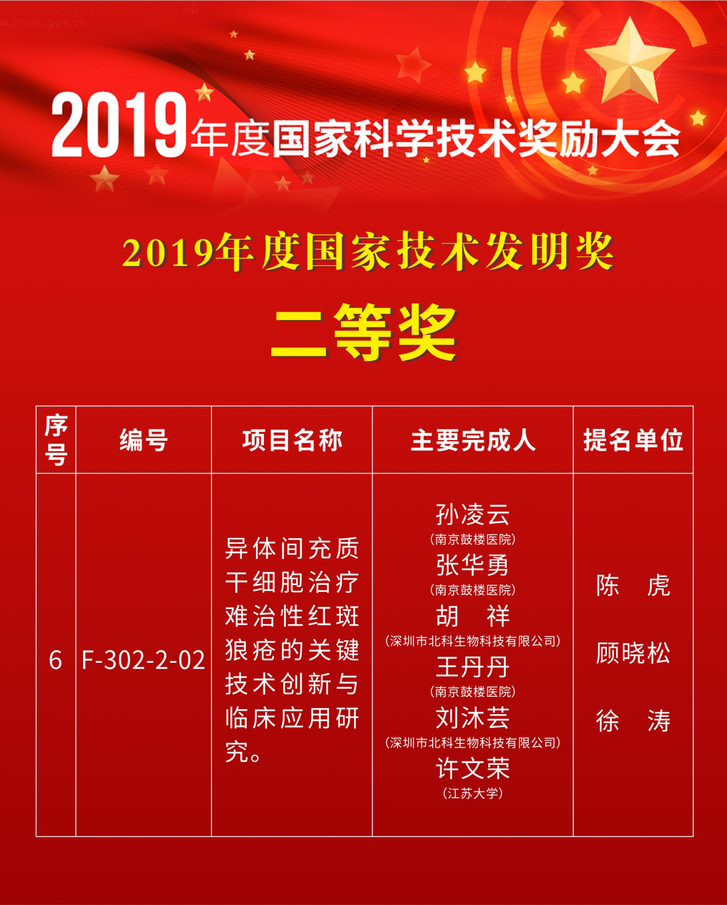 2020年1月10日,中共中央、國務(wù)院在北京舉行2019年度國家科學(xué)技術(shù)獎勵大會,這是科技界一年一度的盛宴,是中國科技界的最高榮譽(yù),是黨和人民對科技工作者的最高褒獎。南京大學(xué)醫(yī)學(xué)院附屬鼓樓醫(yī)院風(fēng)濕免疫科孫凌云,張華勇,深圳市北科生物科技有限公司胡祥、鼓樓醫(yī)院王丹丹、北科生物劉沐蕓、江蘇大學(xué)許文榮等共同完成的成果“異體間充質(zhì)干細(xì)胞治療難治性紅斑狼瘡的關(guān)鍵技術(shù)創(chuàng)新與臨床應(yīng)用研究”榮獲國家技術(shù)發(fā)明二等獎。