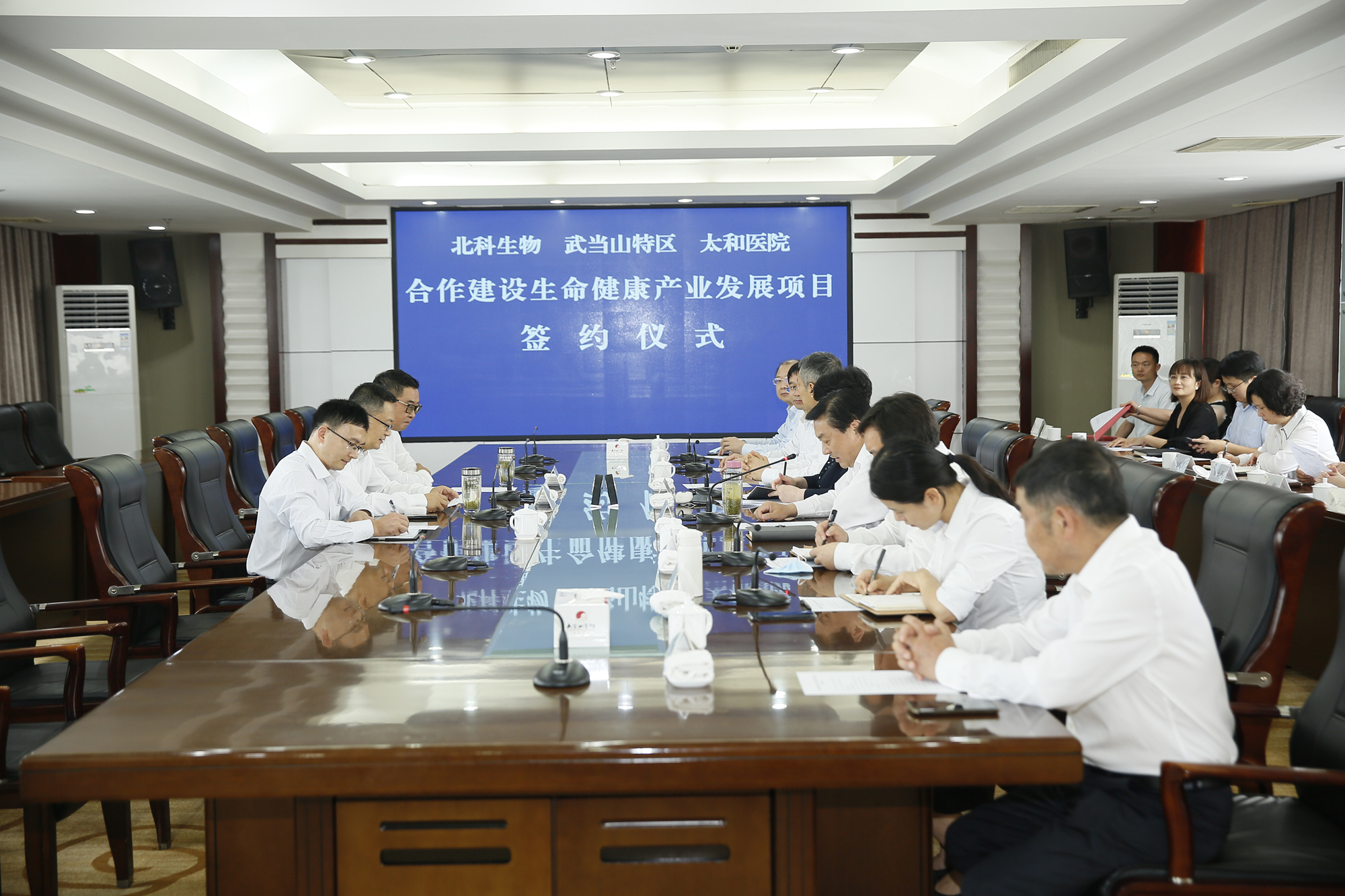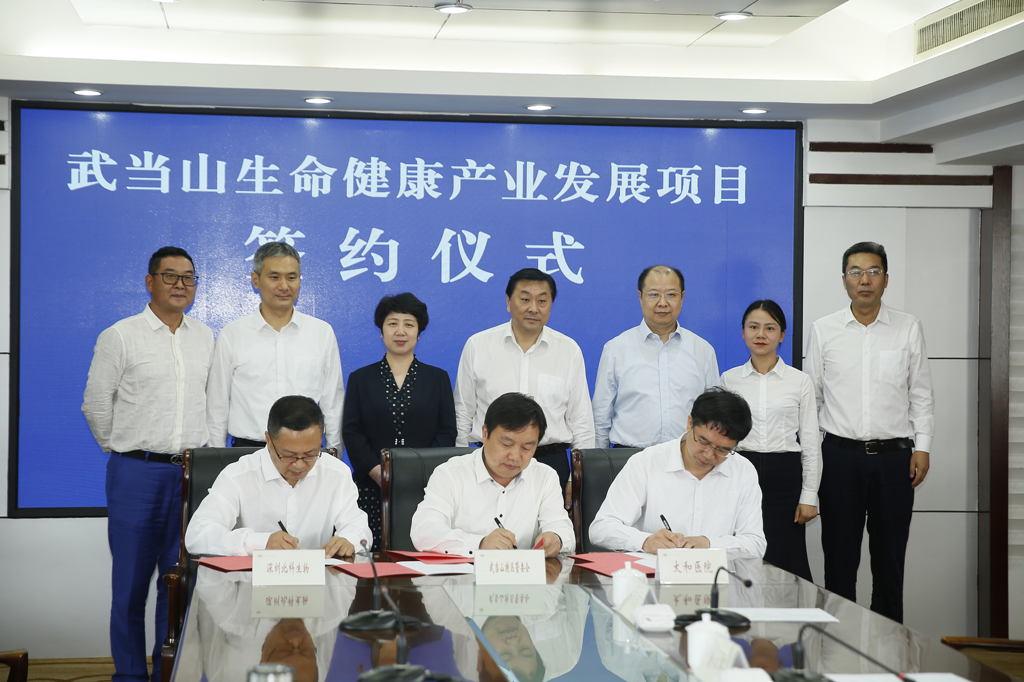 簽約儀式現(xiàn)場,深圳市北科生物科技有限公司、特區(qū)管委會(huì)、太和醫(yī)院代表三方共同簽訂了協(xié)議。北科生物科技有限公司與太和健康投資管理有限責(zé)任公司簽訂了協(xié)議。