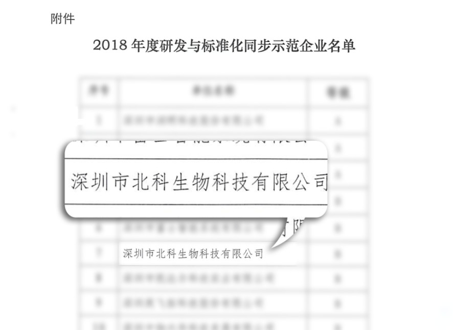 2019年02月20日,深圳市市場監(jiān)督管理局發(fā)布的深市監(jiān)[2019]41號文件,深圳市北科生物科技有限公司(以下簡稱:北科生物)榮獲“研發(fā)與標準化同步示范企業(yè)”稱號。